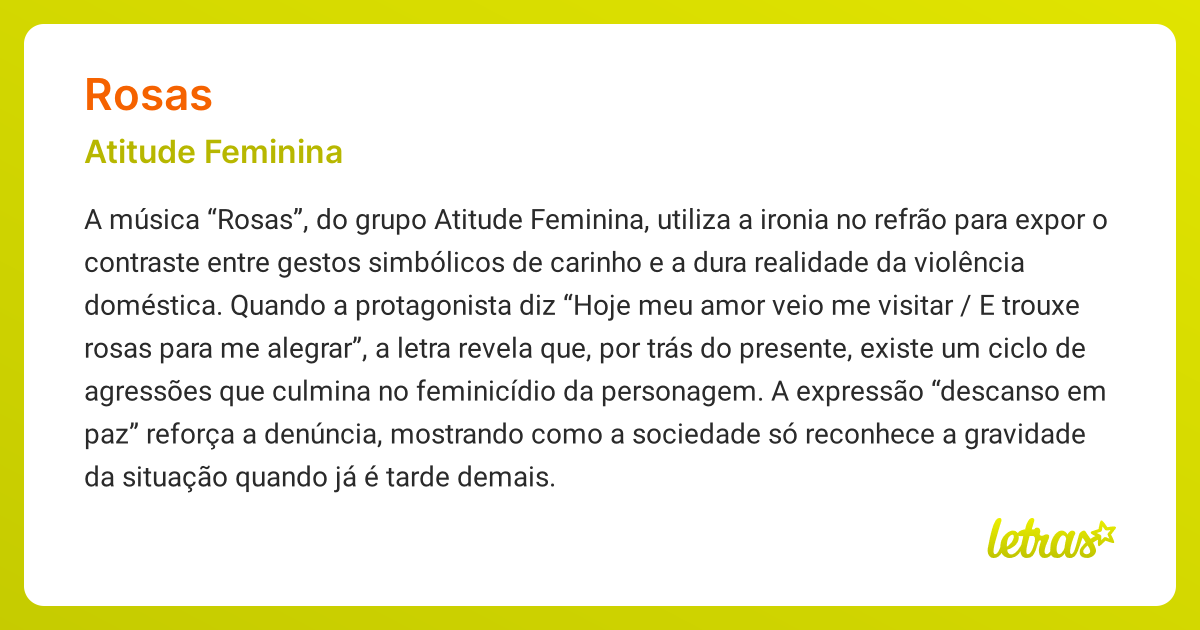 A análise crítica de letras que naturalizam ou glorificam a violência contra a mulher é crucial. Ao desmascarar essas mensagens e promover o debate sobre o impacto da cultura na perpetuação da violência, é possível conscientizar o público e contribuir para a prevenção e o combate à violência de gênero.